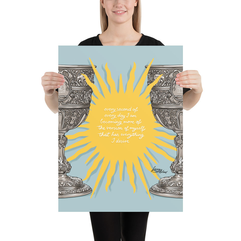 Each piece contains a written affirmation and a hidden sigil. Sigils are visual symbols infused with energy and intention, acting as anchors for manifestation. This artwork features a sigil on the cups, representing: "I attract wealth just by being"